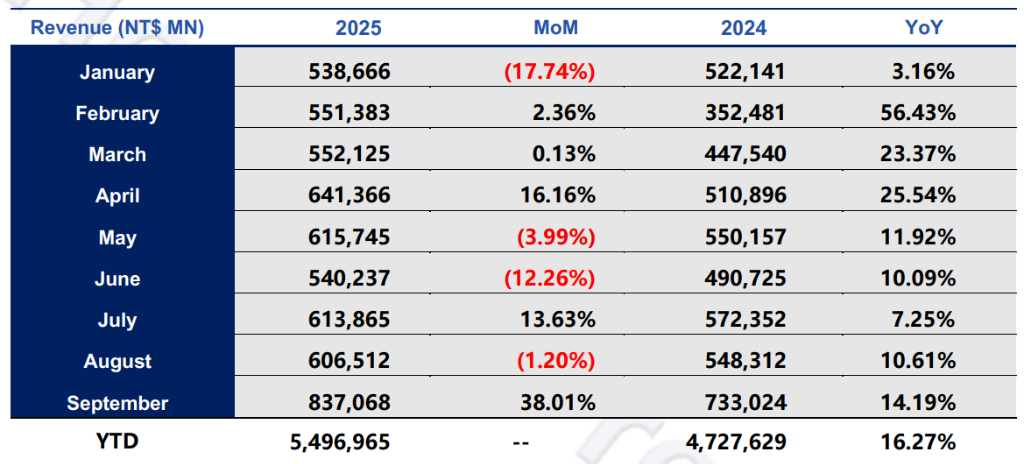 9月营收达到8,371亿新台币,这一数字不仅较8月大幅增长38.01%,同时也创下历史同期新高,超越了此前2022年9月创下的8,223亿新台币纪录。